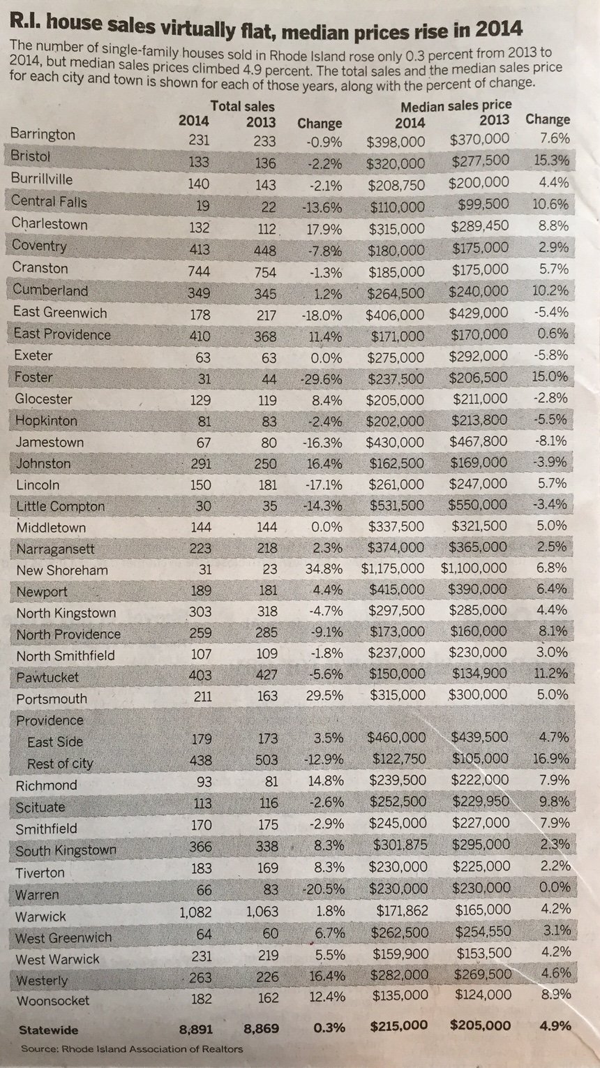 This past week I came across two separate indications about what may happen to the residential real estate market in southern New England, and elsewhere, in 2015. The first was actual data that demonstrated that while sales were down in 2014 compared to 2013, the prices had risen close to 5%…and this is in Rhode Island, traditionally one of the “lagging indicators” of all states and historically one of the last to exit from economic downturns. See the below: